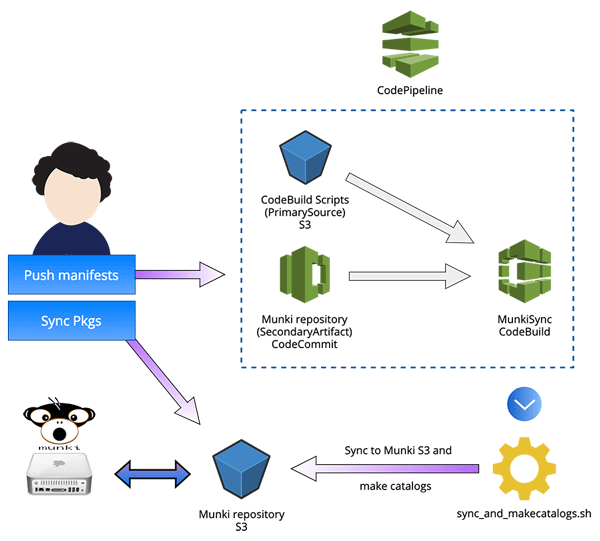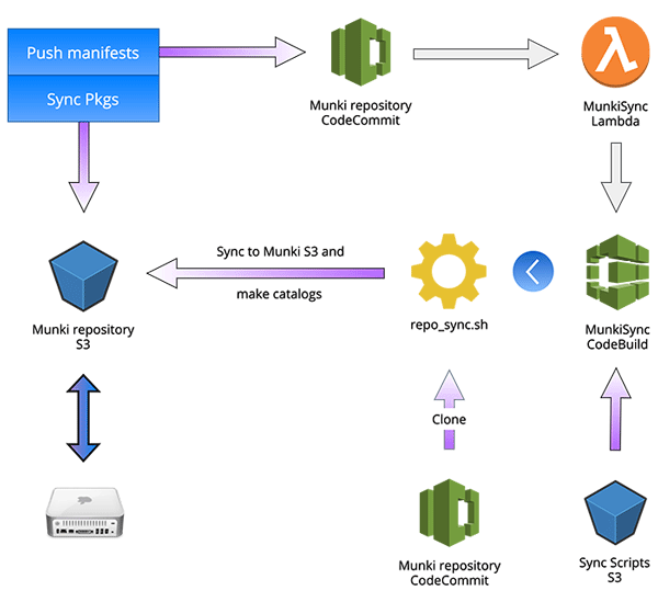In a nutshell: /manifests and /pkgsinfo of our Munki repo are pushed to CodeCommit, which sets a CodePipeline in motion that makes a CodeBuild container sync the repo to an S3 bucket and then does makecatalogs on the bucket with @clburlison’s Munki-s3Repo-Plugin. Packages are synced to the bucket via aws s3 sync. We use @waderobson’s Munki middleware s3-auth on clients to access the Munki repo.